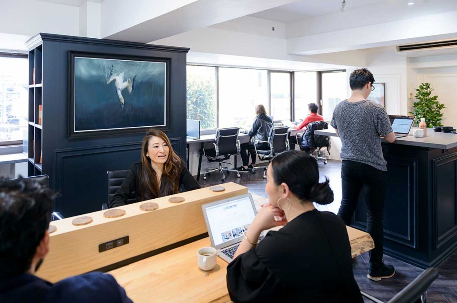 広々としたフロアに絵画やオブジェ、革張りのソファやグリーンなどを配して快適性のある空間です。 集中ブース・リラックススペースも設置。目的や用途に応じて使い分けが可能です。
