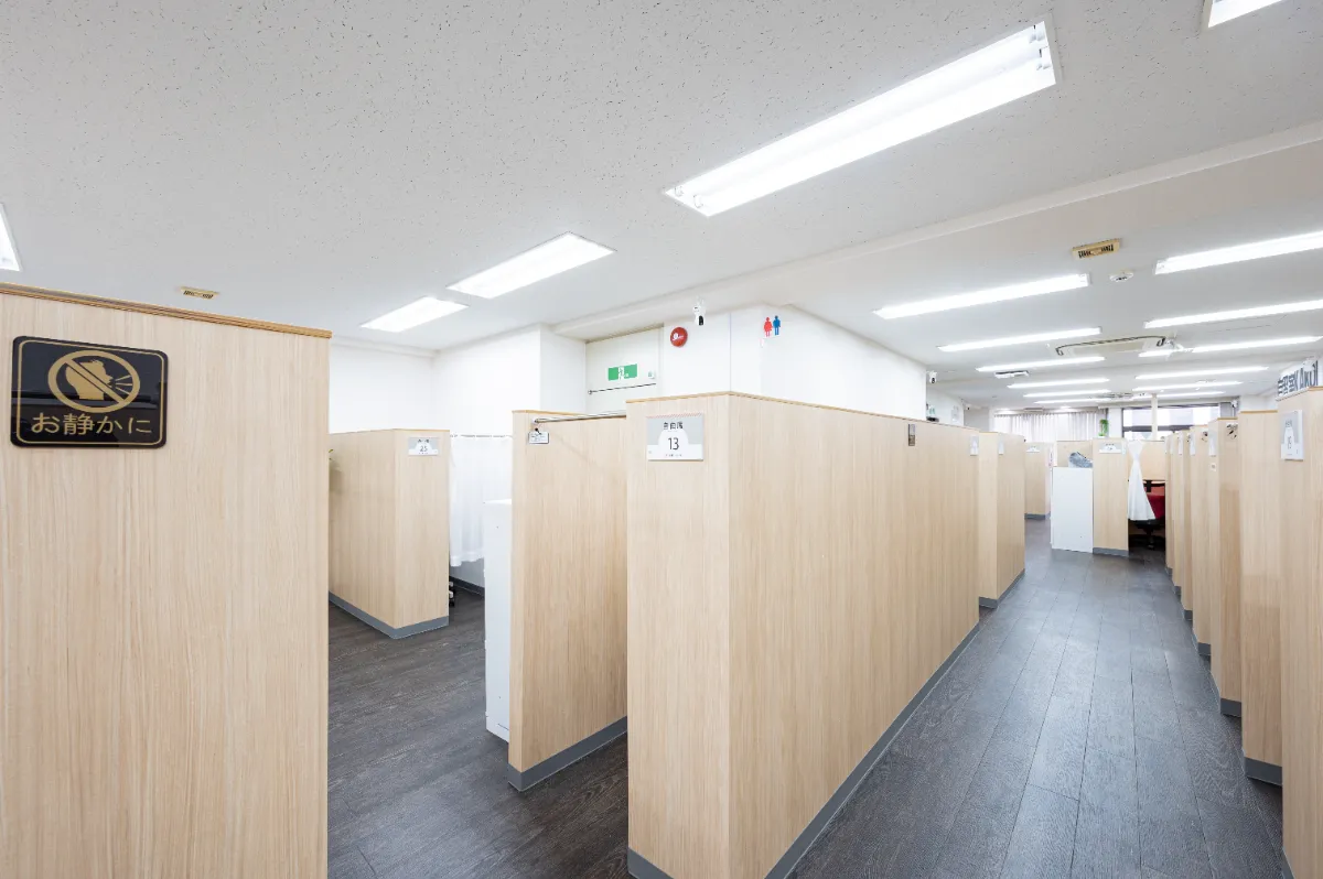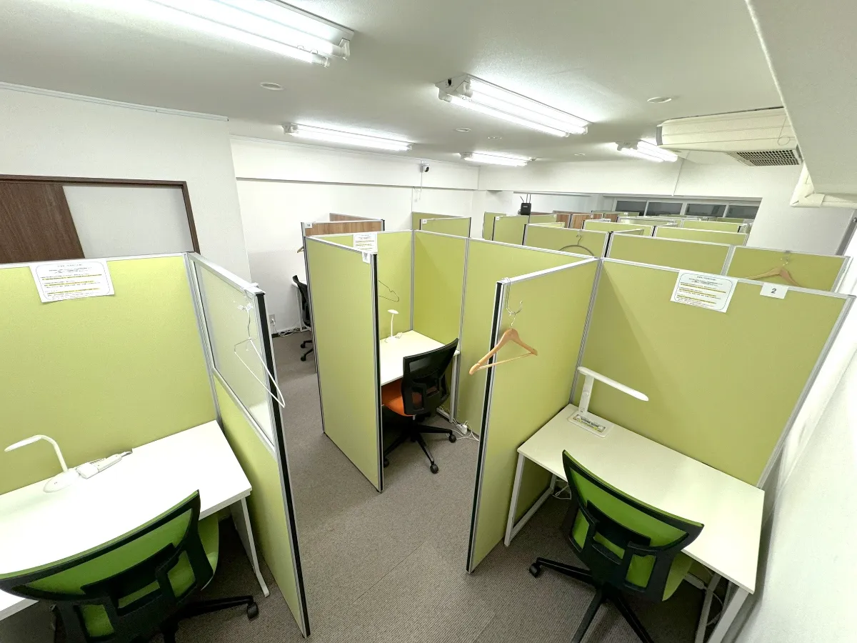 半個室ブースやカーテン個室のある会話・通話禁止の勉強専用自習室。 男女別トイレや食事専用スペースもあります。 受験生・資格勉強の方が多いです。